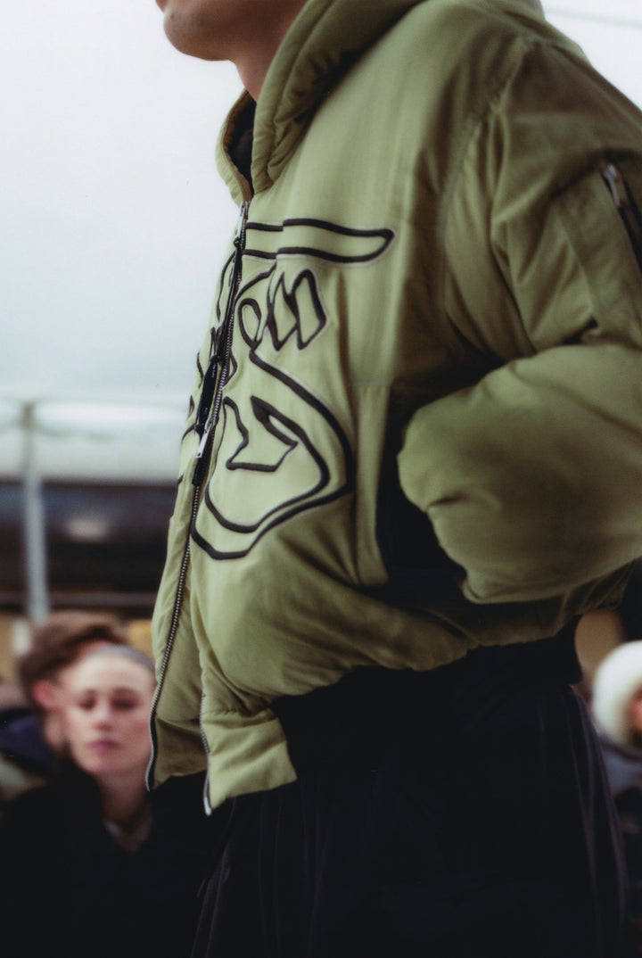 Hoiy is a cropped bomber jacket in gray green color with spray effect and "ALIS" grafitti embroidery made from polyester with a nylon linning.